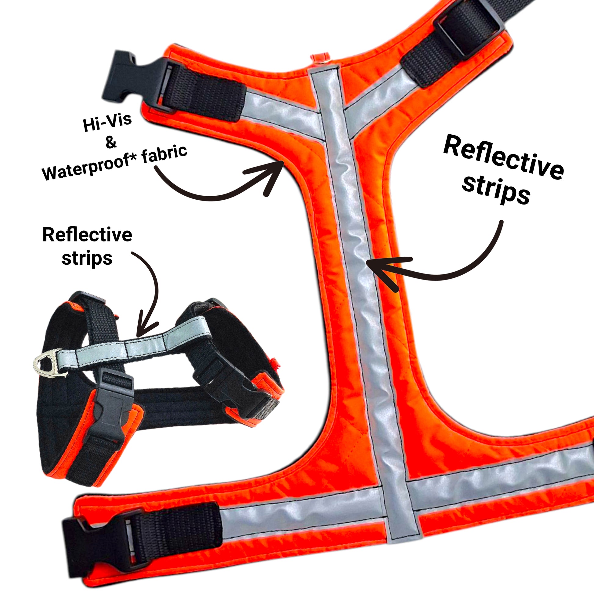The reflective strips are individually sewn onto the Hi-Vis Waterproof Quilted fabric and also onto the back piece of the harness. This means your dog will be highly visible whether it's in daylight or in the dark!